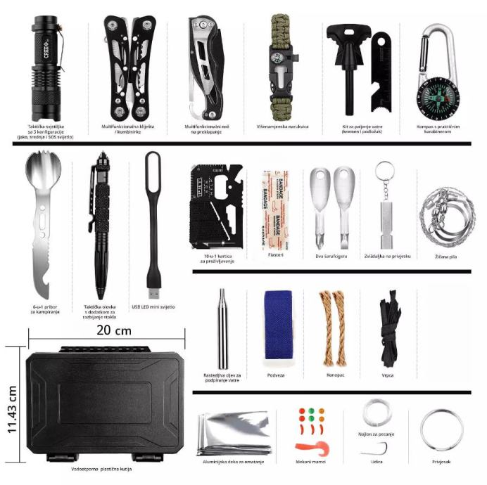 Bez obzira tražiš li poklon za nekog posebnog ili želiš obogatiti vlastitu opremu, ovaj set za preživljavanje je pravi izbor. Svaki alat je dizajniran da ti pruži sigurnost i mir u neočekivanim situacijama. Savršen za ljubitelje prirode, planinarenja, kampiranja, kao i za svakoga ko cijeni dobru pripremu.