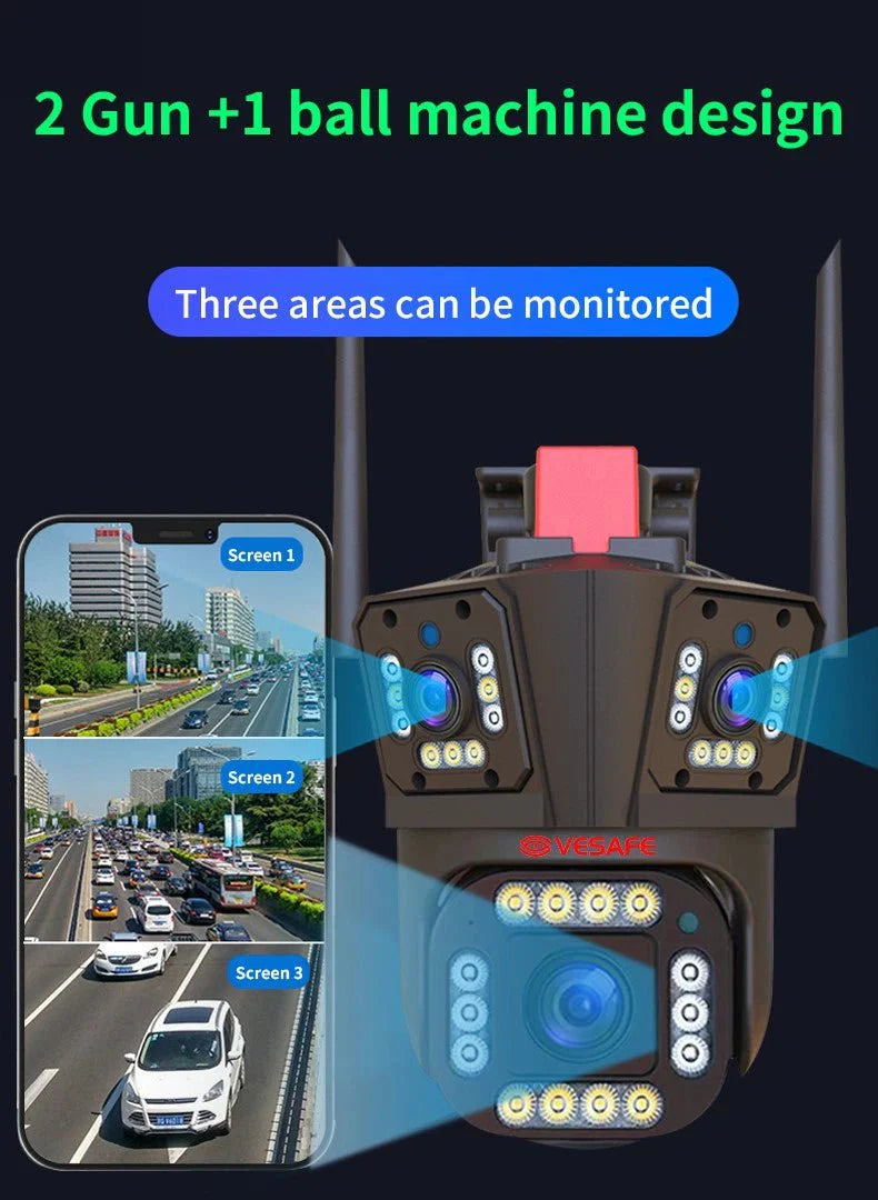 Tri sinhronizovana objektiva omogućavaju nadzor iz više uglova u isto vrijeme — bez mrtvih tačaka, bez potrebe za dodatnim kamerama.